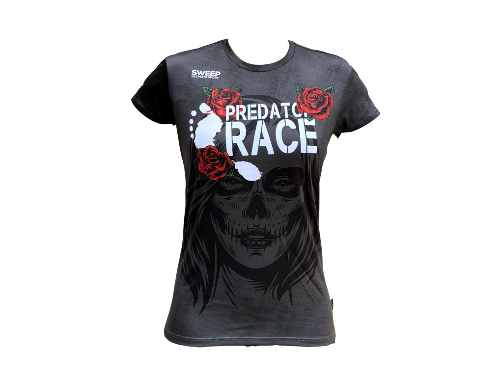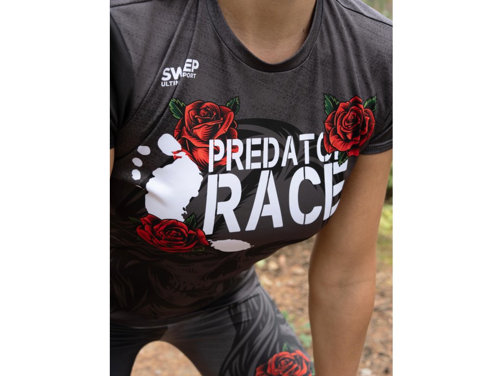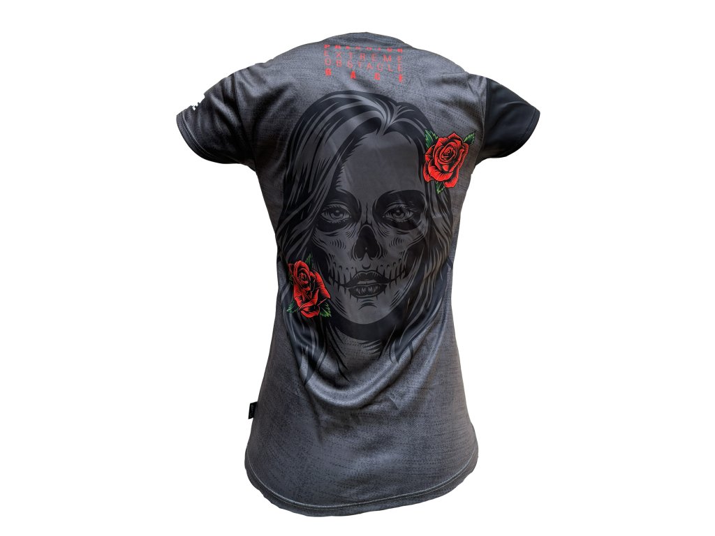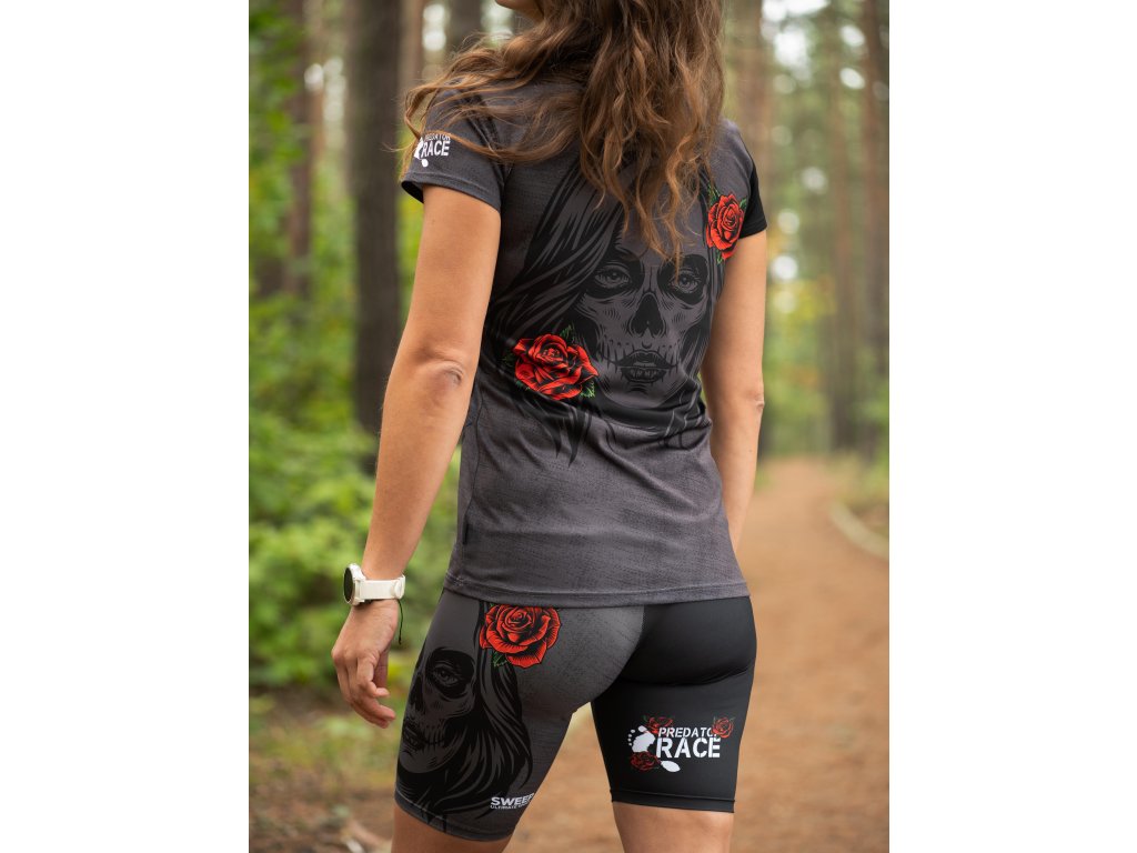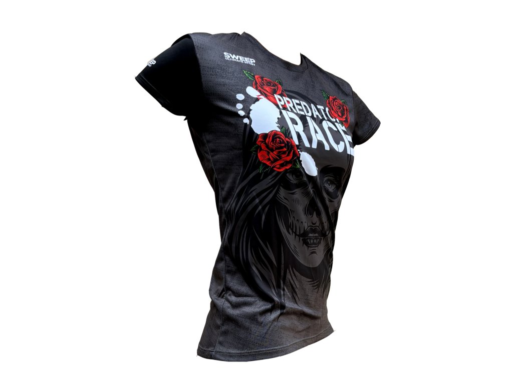 Dámské funkční tričko v progresivním designu kombinace lebky a červených růží. Bílé logo Predator RACE na prsou a nápisem Predator extreme obstacle RACE za krkem.